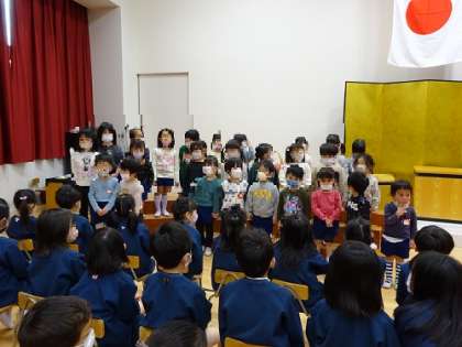 式の途中で在園児が入って、お礼の言葉と歌を修了児に届けます。
