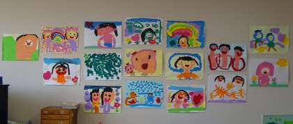 お弁当を食べながら、「私の絵はあそこだよ!」「○○ちゃんの可愛いね!」など、絵を見ながら嬉しそうに話していました。