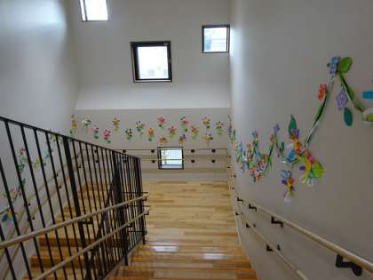 階段に飾りをつけて修了のお祝いの気持ちを伝えています。