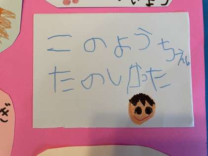感謝のお手紙(5歳児) 公開日 2023/03/14 更新日 2023/03/14 お知らせ 先生たちとの思いでを絵や字にしていました。どのお手紙もとても素敵です。 写真1枚目 グラウンドに行くときに毎回荷物を運んでくれたことを思い出してかいていました。 写真2枚目「このようちえんたのしかった」と一生懸命かいていました。そういってもらえると、先生たちはとてもうれしいです。 写真3枚目 園長先生と一緒にドッヂボールをした時のことをかいていました。 いいね(0)