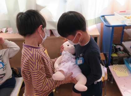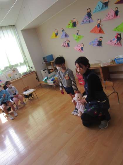 大きさ50cm重さ3kgの赤ちゃん人形をひとりずつ抱っこして、お母さんのお腹の中で育ったことや、今はこんなに大きくなったことに思いをはせました。