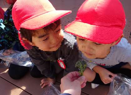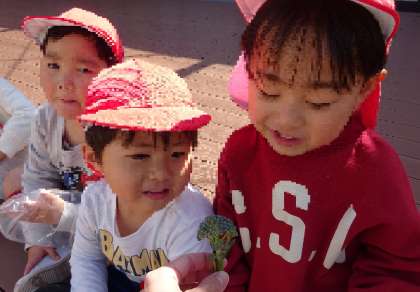 みんなで収穫した後、匂いをかいでみました。「おいしそうな匂い!」「ブロッコリーの味してきた!」とかわいいつぶやきがたくさんでした!