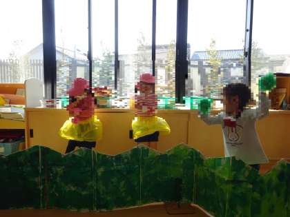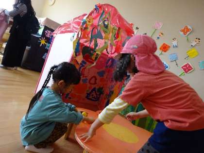 今日は一日入園があり、幼稚園に来るお友達が遊びに来ました。子どもたちもとても楽しみにし、一緒にダンスをしたり、ままごとをして遊んだりしました。4月から一緒に幼稚園で遊ぶのが楽しみですね。