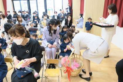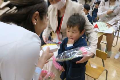 入園式では、担任からお祝いにお花(ガーベラ)とお饅頭をいただきました。