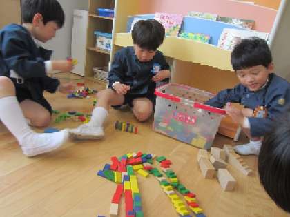 写真上 絵本の部屋で、ブロックで遊んでいます。新しいお友達と明日から一緒に遊べることを楽しみにしています。