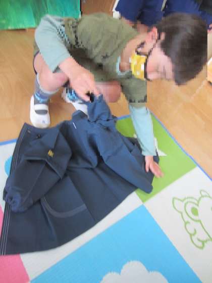 制服のボタンをはずしてあげたり、制服をたたんであげたりして優しく関わる姿が素敵でした!お外でも一緒に遊び、お砂場で一緒にままごとして遊んでいる子もいました!