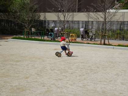 それぞれ遊具の遊んだり、また、三輪車に乗ったり…。