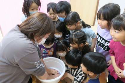 手を石鹸で洗っていない担任の先生に薬をかけてみようと言うと、「どんなバイキンが出てくるんやろ?」と皆じっと見ていました。