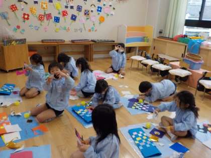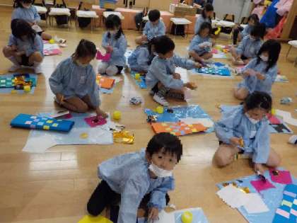 本当のこいのぼりみたいに、いろいろな色の目になるように、紙を重ねて、貼って、丸に切って、、、を繰り返しながら、じっくり取り組みました。「難しいなあ」「でも紫の色もいれたい」などとつぶやきながら頑張っていました。