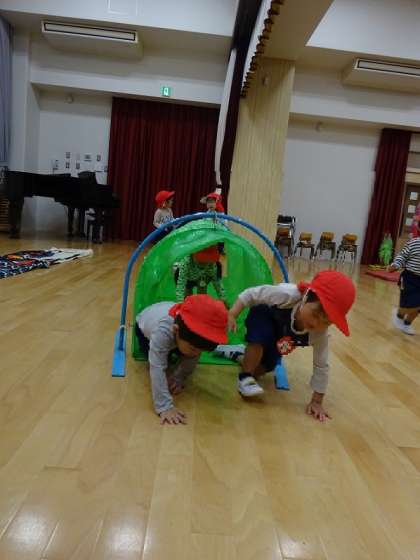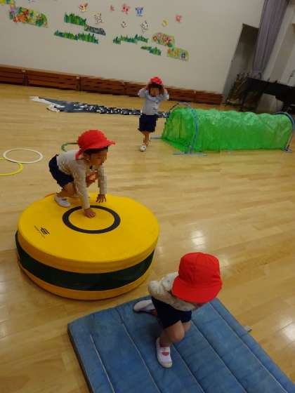 今日は雨でお外で遊べなかったので、遊戯室で体を動かして遊びました。