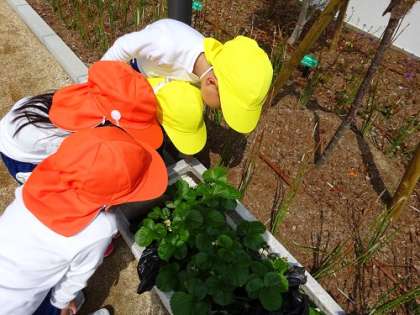 イチゴのフラワーベースをのぞき込んでいるので、何に興味をもっているのかと思いきや、ダンゴムシやゲジゲジ(ヤケヤスデ(触ると防御のためにおいを放ちます)でした。
