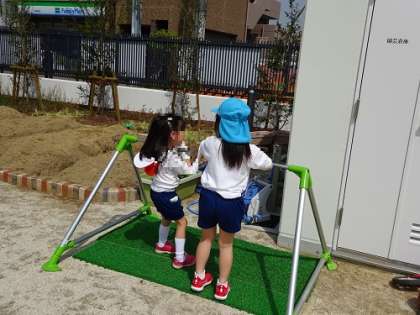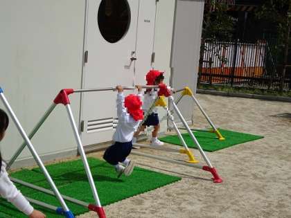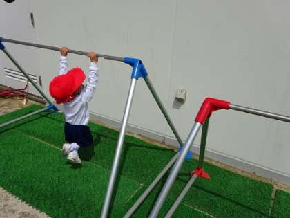 と鉄棒の高さを知り、また、自分の背の高さと比較をしています。