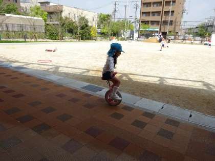 一輪車でスタートからどこも持たずに乗ることに挑戦しています。(空中乗り)