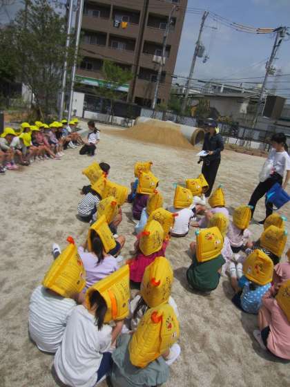 今年度初めての避難訓練、年長児がお手本となり、避難する様子を小さい組の友達が見学していました。