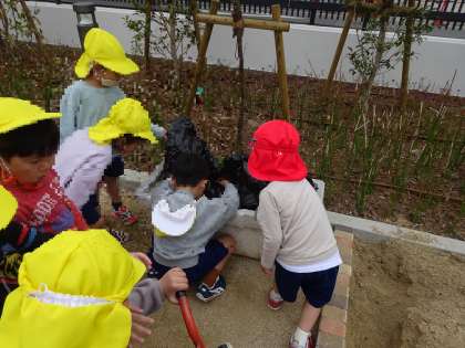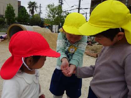 ダンゴムシを一緒に探したり、見つけたダンゴムシを3歳児に見せてくれたりしていました。