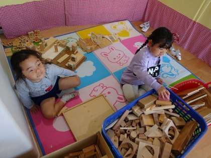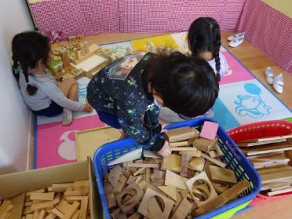 先生たちが少しずつ集めている木工を組み立てて遊んでいます。