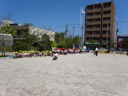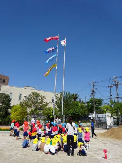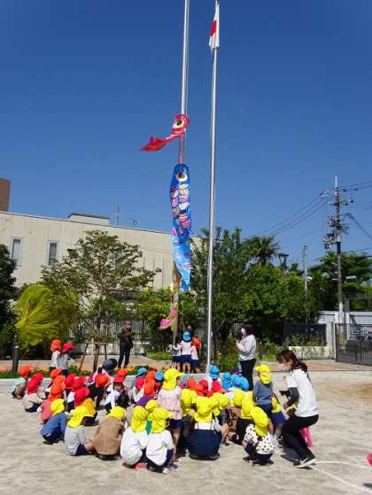 5歳児の子どもたちの手作りのこいのぼりを揚げました!