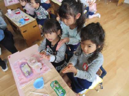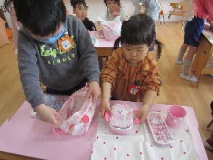 今日からいちご組さんのお弁当が始まりました。ワクワクしている姿がとてもかわいかったです!つき組が、お弁当を出したり置いたりするお手伝いをしました。