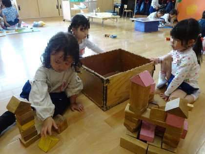 「お城ができたよ」というお友達を見て、自分もつくってみようと思ったのか、、、隣で一緒につくり始めました。近くで遊ぶ友達の刺激をたくさん受けています。