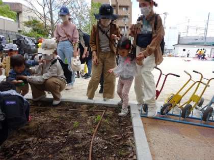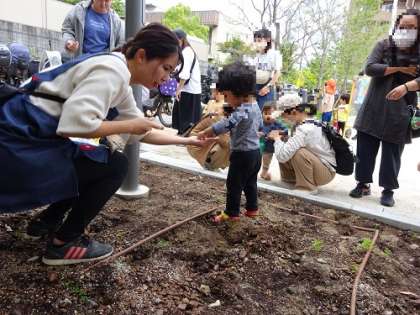 先生から種をもらって土に植えて、優しく土の布団をかけています。