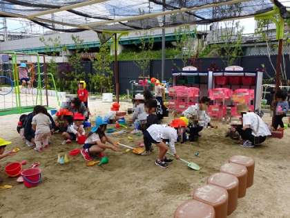 園庭の砂場でもままごと遊びをしています。 在園児とのふれあいもあり、楽しそうです!!