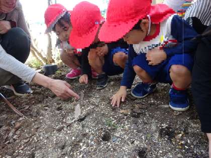 とみんなで種をじっくり見てから、一粒ずつ小さな穴に植えていきました。