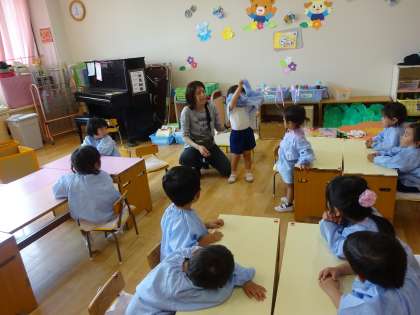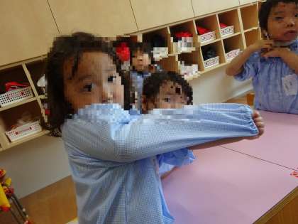 今日はみんなでお絵描きをした後、遊び着を裏返らないで脱げる脱ぎ方を先生とチャレンジしました。