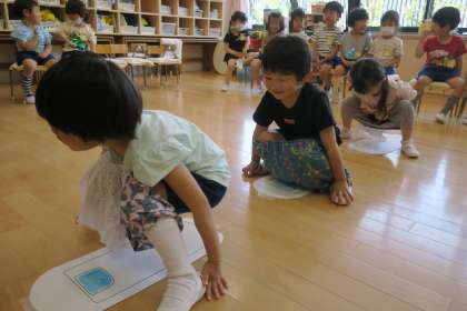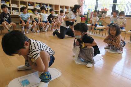 ズボンをおろすタイミングや座る位置も確認して、本当の和式トイレでもやってみたい!公園のトイレでも頑張る!と意欲をもった子どもたちです。