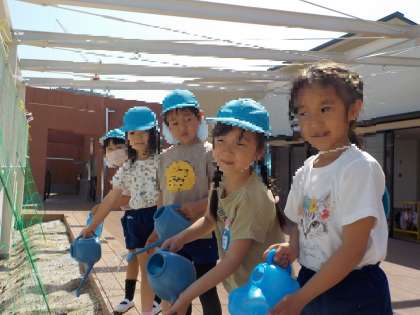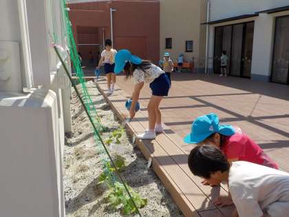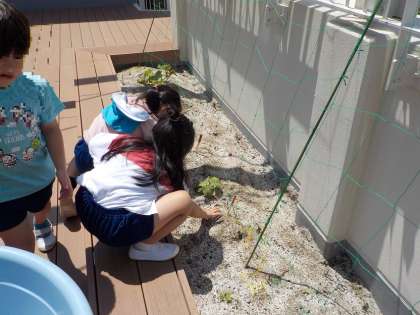お水やりにいくと、キュウリの苗に黄色いお花が咲いているのを見つけました。