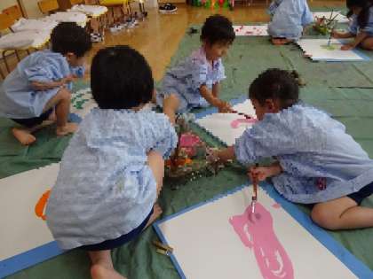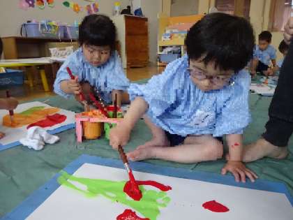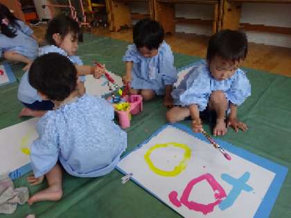 絵の具で絵をかいたよ(3歳児) 公開日 2023/05/19 更新日 2023/05/19 お知らせ 今日は筆を使って絵の具で絵をかきました! 手形やデカルコマニーで絵の具にふれていましたが、筆を使ってかくのは初めてです! とっても興味津々にお話を聞いていました。 画用紙に絵の具がのると、とっても嬉しそうでした! 「先生見てみて!」「まるってかいたよ」「この色も使っていい??」 といろいろな色を楽しみながら、のびのびと自分のかきたいものをかいていましたよ! いいね(0)