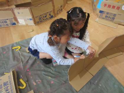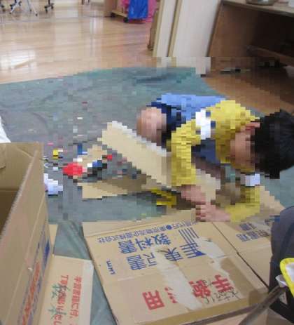 段ボールを切ったり、ガムテープでくっつけたりしてお家づくりをしています。