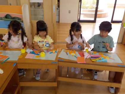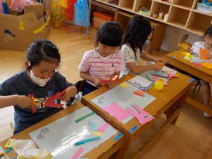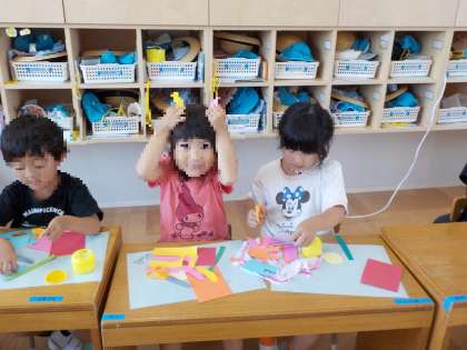ありがとうの花 公開日 2023/05/22 更新日 2023/05/22 お知らせ もうすぐ竣工式です。 新しい幼稚園おめでとう!ありがとう!という思いを込めて、「ありがとうの花」をつくりました。 「あーりがとうの花が咲くよ♪」と、歌いながらつくっていました。 紙を重ねると同じ形が切れることも発見。 「見て〜うさぎ〜」と、頭にあてて、楽しみながらつくりました。 いいね(0)