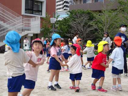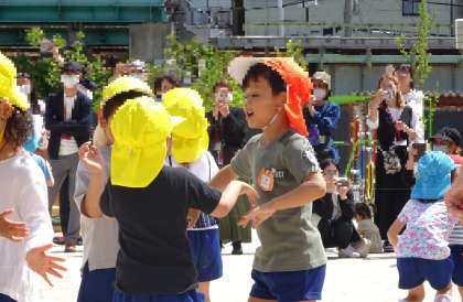 年長児は、優しく年下の友だちの手をひいて踊っていました。