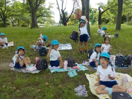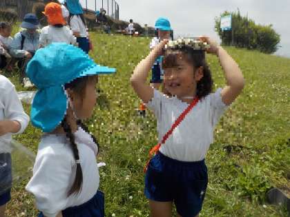 食べた後は、シロツメクサの冠づくりの続きをしたり、クジラの滑り台で遊んだりして、めいっぱい遊びました。