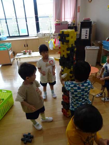 今日は四角形につなげたブロックを上に高く積み上げて遊んでいました。一人が積み始めると、他の子も近くに寄ってきて一緒に積んだり、崩れて「きゃ〜!!」と言いながら喜んだりして楽しんでいました。崩れても、また積もう!!と、繰り返し何度も試して遊んでいました。