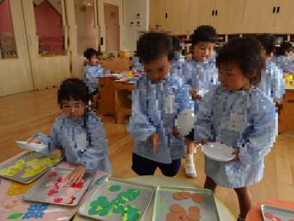 と、自分でお弁当の中身を選んでいました。糊も「指にちょっと」と言いながらつけることを楽しんでいましたよ。「もっとお代わりしてもいい??」とたくさんつけるのを楽しんでいる子や、並べて貼るのを楽しんでいる子、個性豊かな「自分だけのお弁当」ができました!