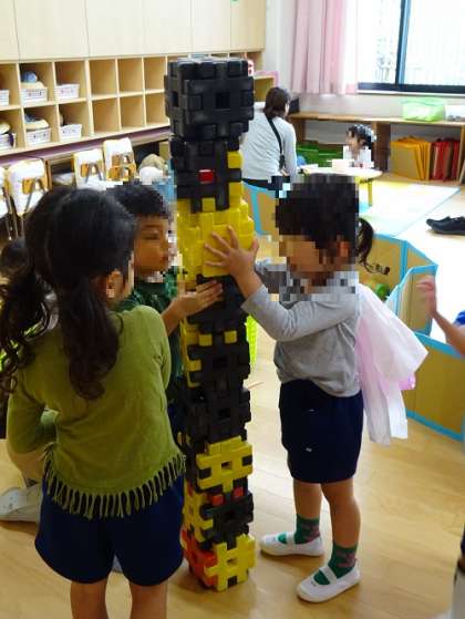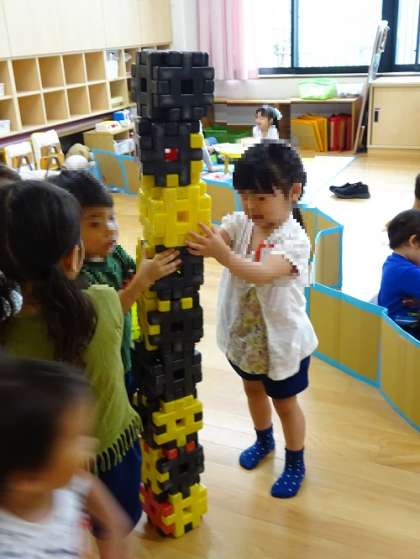 ブロックを高く積んで、壊して、また積んで遊んでいます。