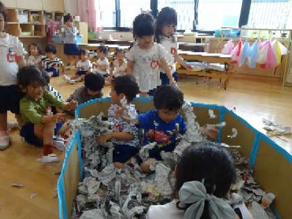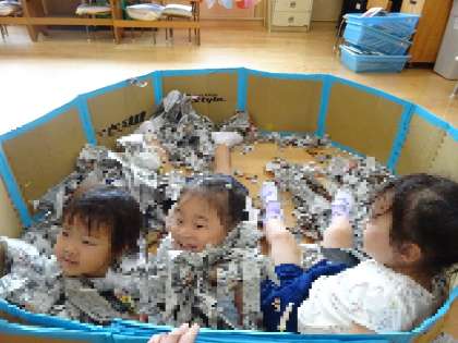 「ちぎれても大丈夫!」と言うと、徐々にちぎることが楽しくなってきました。たくさんちぎってお部屋が新聞いっぱいになりました。それを上に投げて、新聞のシャワーをしてみたり、海のように泳いでみたり、、、最後は枠の中に入れて新聞プールをつくってみました!「先生!もう一回入りたい!!」と新聞プールの中で寝転がったり頭からかぶったりして、思いっきり楽しんでいましたよ!