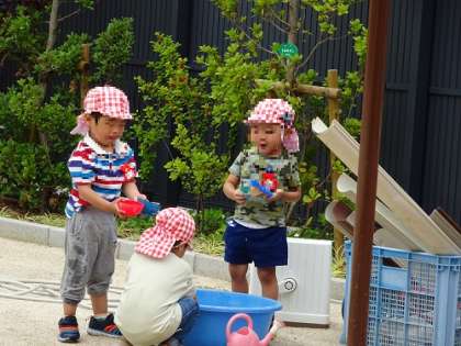 砂場では、在園児の真似をして水を出して遊び始めています。