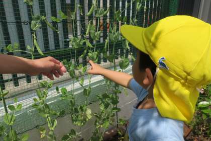 昨年度に植えたスナップエンドウを、ほし組さんが収穫しました。