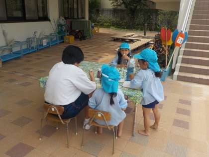 写真2枚目 色水遊びのレストランにお姉さん先生も来てもらいました。