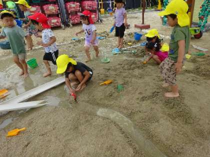 園庭の遊び(ほし組) 公開日 2023/06/15 更新日 2023/06/15 お知らせ 泥遊びを毎日していると、遊びが広がっていきます。 個々に海や池を作っていると、 「海と海つなげてみたい」 と道を作っていました。 つながって水が流れると 「いけた!」 と歓声が。 いろいろな道がつながりました! いいね(0)