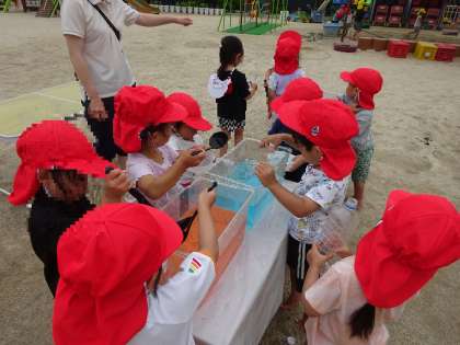 今日も戸外では色水のジュースやさんが大盛況!友達と一緒に色を見合いっこしたり、道具を貸し合いっこしたり、、、一緒に遊ぶ楽しさを味わっていました。