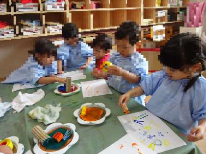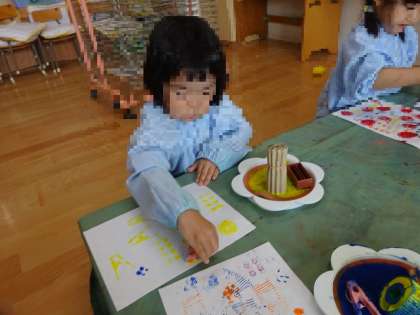 保育室では、色々な形の遊具と絵の具を使ってスタンピングを楽しみました。
