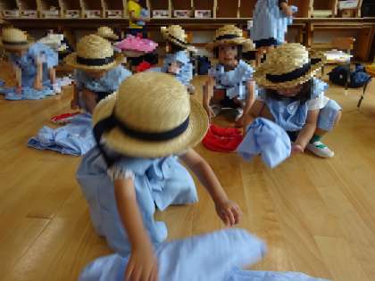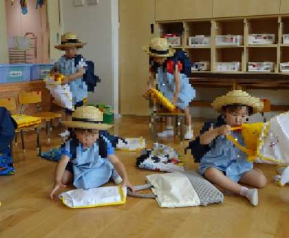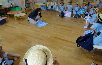 持って帰るものの確認、遊び着や座布団カバーをたたんで入れること、など一緒にしました。小さな手で一生懸命自分なりに頑張っていました。