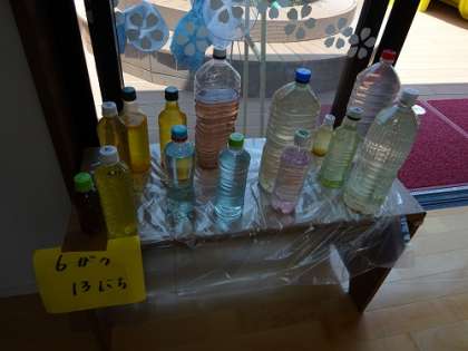 「先生 置いといて!」と一生懸命作った色水を置いておきたいのでしょう。