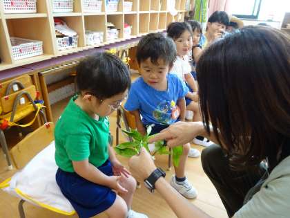 「園庭のはっぱに幼虫がいてたよ。みてみて。」