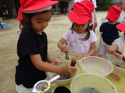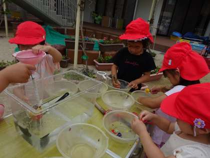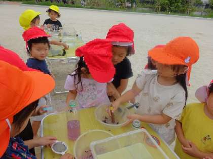 色水遊び(3歳いちご組) 公開日 2023/06/21 更新日 2023/06/21 お知らせ 年少組はクレープ紙を使って今まで色水遊びをしていましたが、今日は年長のおともだちがお花を使って色水遊びをしているところにおじゃましました。 年長児のようすに興味津々です。 「すごいね!」 「お花から色でてる!」 見よう見まねでいちごぐみさんもはじめました。 いいね(0)