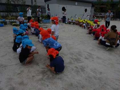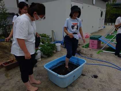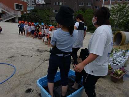 田植え 公開日 2023/06/23 更新日 2023/06/23 お知らせ 稲を養護教諭のつながりで、他の幼稚園からいただきました。 稲用の土を購入し、タライで田植えをしました。 最初は、土作りから。 タライに入って、足で踏んでかき混ぜます。 このドロドロに抵抗を示さないように、まず担任から! 「キャー!!」と担任の楽しい声が、子どもたちに期待の気持ちを上げます。 いいね(0)
