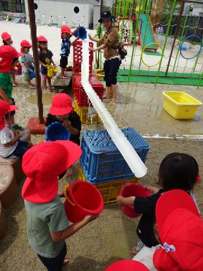 「上から流したい!」という子と、流れてきた水を「下で受けとめたい!」という子と、それぞれいましたが、みんなちゃんと並んで待っていました!
